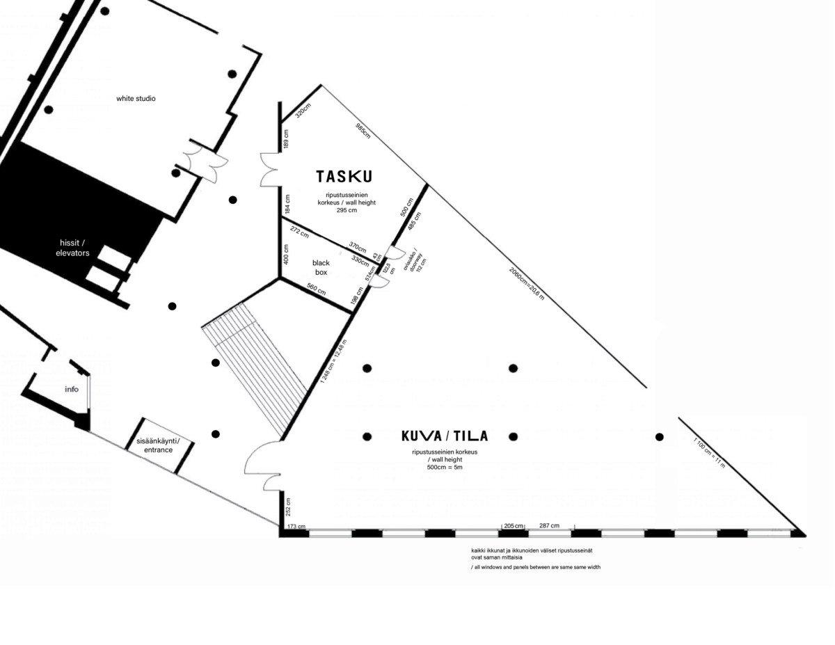 There will be a call for exhibitions at Kuva/Tila once a year in the spring, when it is possible to apply for exhibition slots for the next year. The exhibition slots that are available for application last 4-5.5 weeks at Kuva/Tila (which also has a black box) and 3-4 weeks at the Tasku gallery (Kuva/Tila). The time slot includes the installation and takedown of the exhibition.