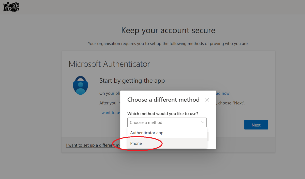 In the Choose a different method window, select Phone from the list and click Confirm.